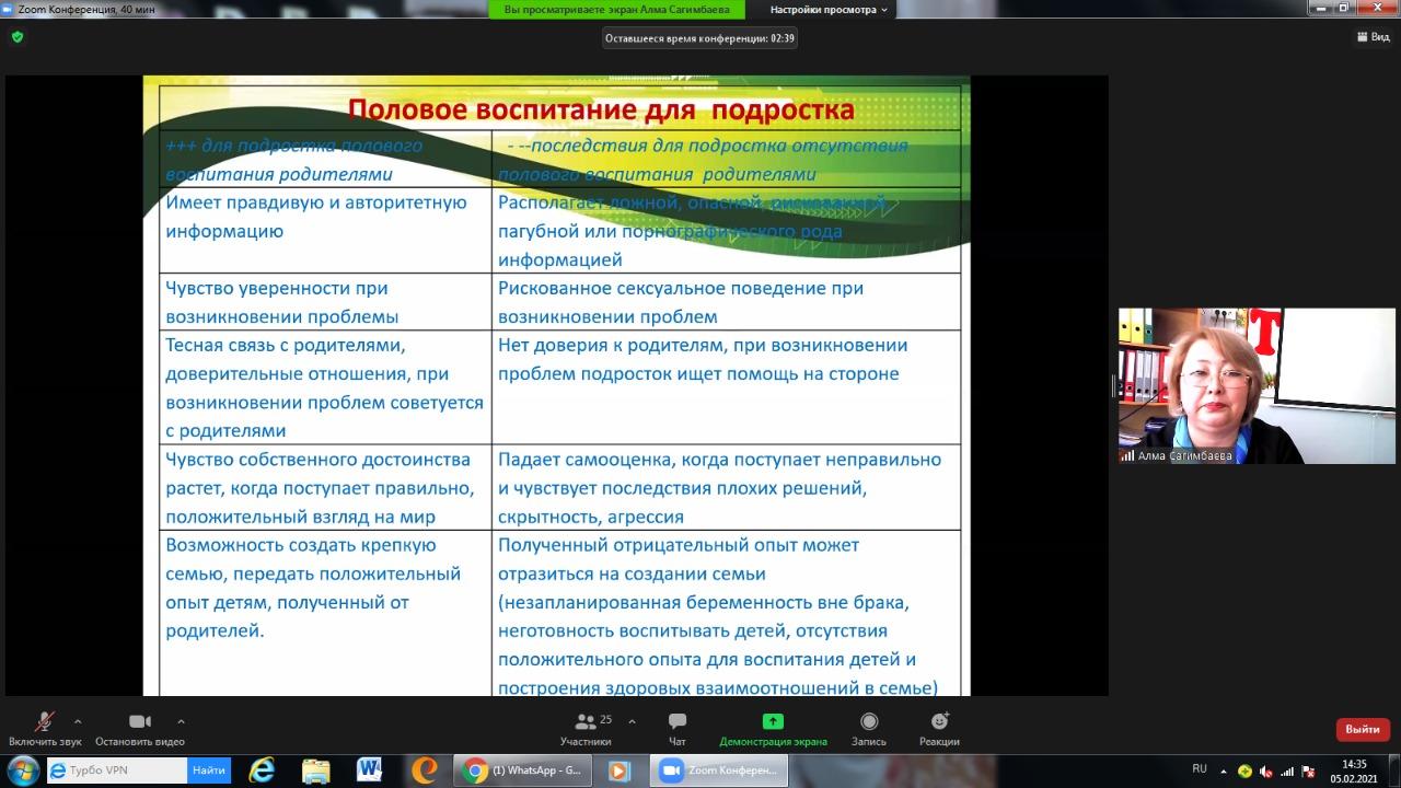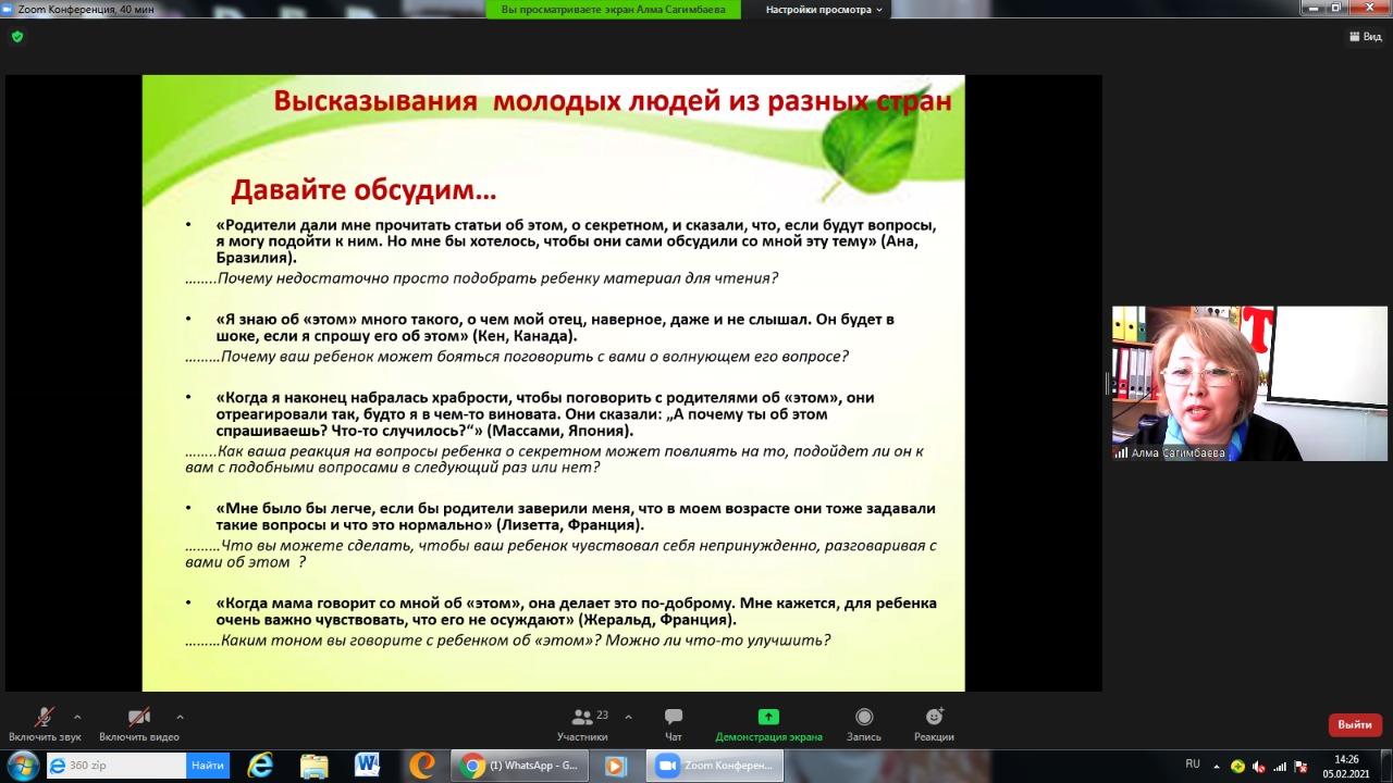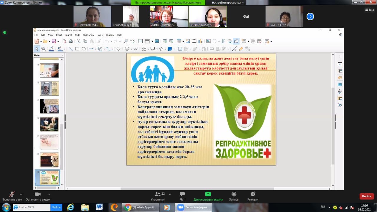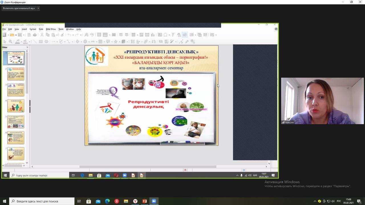 Р.Қошқарбаев атындағы орта мектебінде 2021 жылғы ақпан айында репродуктивті денсаулық бойынша (адамгершілік және жыныстық тәрбие) өткізілетін іс-шаралар жоспарына сай мектеп психологы, медбике және аудандық СӨС насихаттау бөлімінің маманы А.Сергеевнаның қатысуымен тақырыбында ата-аналармен семинар өткізілді. Ата-аналарға репродуктивті денсаулық жайлы мағлұматтар беріліп, жыныстық тәрбие бойынша балалармен қалай дұрыс сөйлесу керек, осы мәселелер бойынша ұсыныстар берілді. Медбике Р.Лим «Жыныстық жолмен берілетін инфекциялар» туралы ақпараттармен таныстырды.