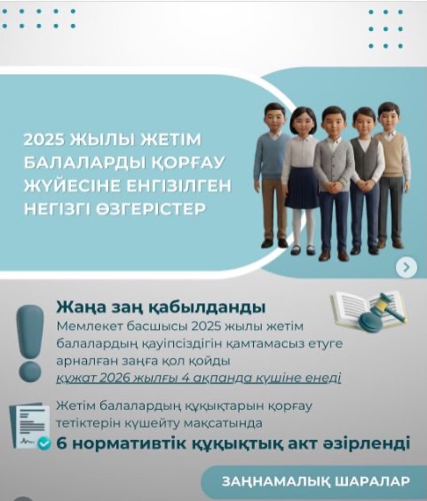 👧🏻 Ағымдағы жылы елімізде жетім және ата-анасының қамқорлығынсыз қалған балалардың құқықтарын қорғау жүйесін жетілдіруге бағытталған бірқатар кешенді шешімдер қабылданды. Балалардың мүддесін қорғауға бағытталған түбегейлі өзгерістердің қатарында – Мемлекет басшысы қол қойған жаңа заңның қабылдануын атап өтуге болады. Аталған заң 2026 жылғы 4 ақпанда өз күшіне енеді.
