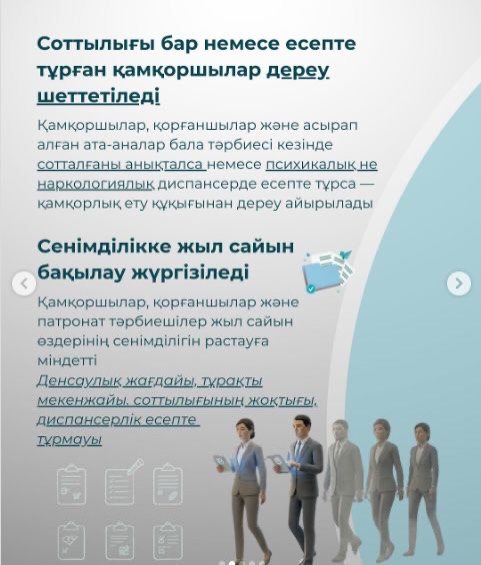 🛋️ Бұдан бөлек, заңнамаға алғаш рет қамқоршылар, қорғаншылар, патронат тәрбиешілер мен асырап алған ата-аналар тарапынан жыл сайын сенімділікті растау міндеті енгізілді. Олар денсаулығы, тұрғылықты мекенжайы, соттылығының жоқтығы туралы мәліметтерді тұрақты түрде ұсынуы қажет. Сонымен қатар, жаңа заң бойынша баланы алдымен жақын туыстарына, ал ондай мүмкіндік болмаған жағдайда — ерлі-зайыпты отбасыларға беру тәртібі заңмен нақты бекітілді.