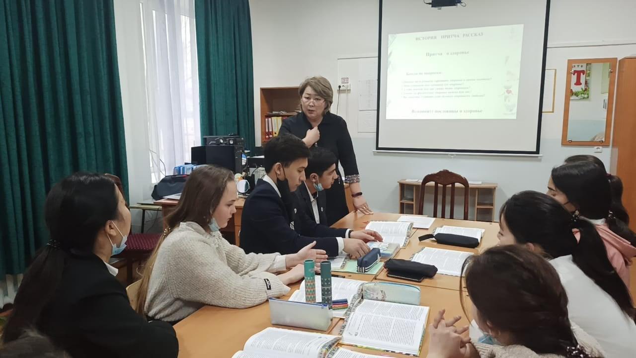 В течение Недели гуманитарного цикла в средней школе имени Р.Кошкарбаева проведено много мероприятий, и одно из них - открытый урок самопознания в 11 классе на тему «Духовное здоровье человека», проведенный учителем самопознания Сагимбаевой А.Е. Ценность, раскрываемая на уроке - Внутренний покой, а качества: умение позитивно мыслить, умение сохранять внутреннее равновесие, гармония. Цель урока: раскрытие важности сохранения духовного здоровья человека через практику общечеловеческой ценности Внутренний покой.