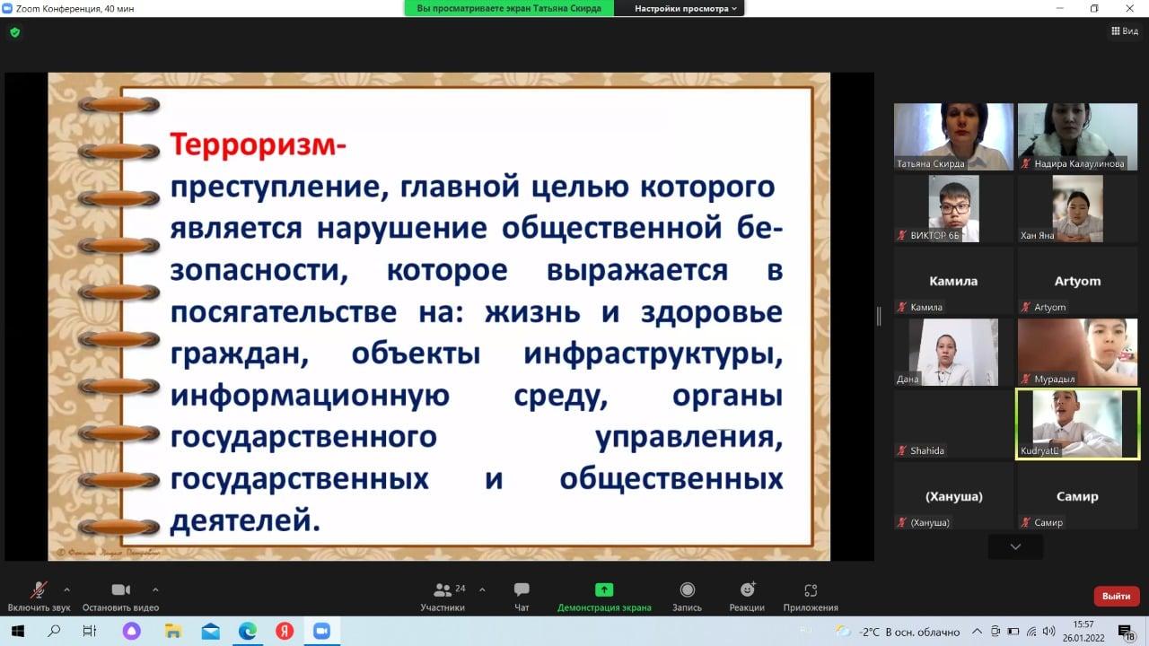 Р.Қошқарбаев атындағы орта мектебінде құқық бұзушылықтың алдын алу бойынша сынып жетекшілер семинары өткізілуде. 4Б- сынып жетекшісі М.Молдыбаева, 6Б - сынып жетекшісі Т.Скирда және 10А- сынып жетекшісі Қ.Құмарбекқызы "XXI ғасырдағы ұлттық сана - ТЕРРОРИЗМГЕ, ЭКСТРЕМИЗМГЕ жол бермеу" тақырыбында ашық сынып сағаттарын өткізді. Сынып сағатының мақсаты: оқушыларға терроризм туралы терең түсінік беру, оның түрлері, себептері мен зардаптарын ұғындыру;
