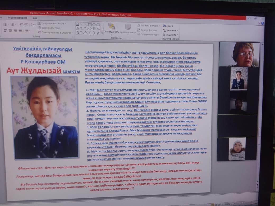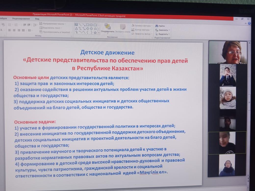 Р.Қошқарбаев атындағы орта мектебінде , «VISION» өзін-өзі басқару аумағының онлайн отырыс өткізілді. Отырыс барысында ҚАЗАҚСТАН РЕСПУБЛИКАСЫНДА балалардың құқықтарын қамтамасыз ету мәселелері жөніндегі балалар өкілдіктерінің жұмысы ережесін талданып, балалардың құқықтары мен заңды мүдделерін қорғау; балалардың қоғам мен мемлекет өміріне қатысуының өзекті проблемаларын шешуге жәрдемдесу; балалардың, қоғамның және мемлекеттің игілігі үшін балалардың әлеуметтік бастамаларын және балалардың қоғамдық бірлестіктерін қолдау мақсаттарымен таныстырылды.