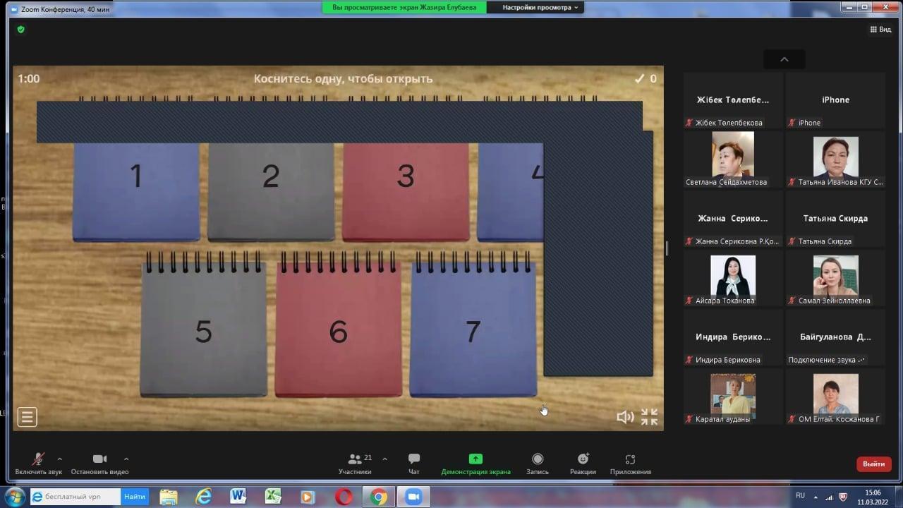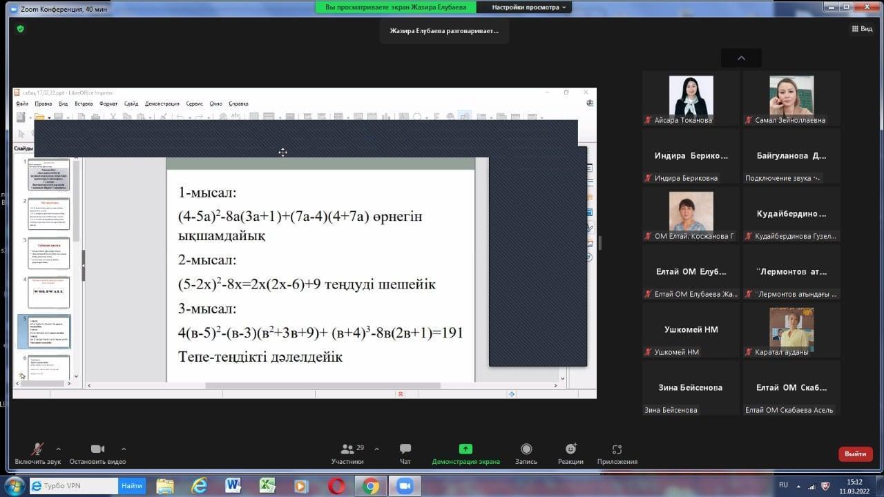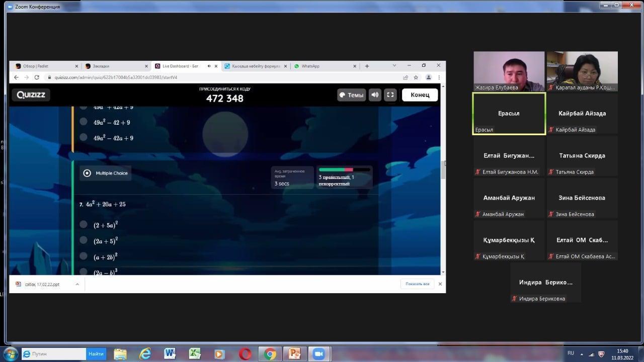 Р.Қошқарбаев атындағы тірек және жетекші мектеп ретінде магниттік мектептері арасында педагогикалық қоғамдастық жұмысында мұғалімдер арасында оқушыларға сапалы білім беруде қолданылатын тиімді әдіс- тәсілдермен алмасу және озат педагогтардың тәжірибесін тарату мақсатында ашық есік күндері ұйымдастырылып турады. Наурыз айы ағымында Елтай МДШОбар отра мектебінің математика пәні мұғалімі Санжанов Мұрат Смаилұлы 7 сынып оқушыларымен "Қысқаша көбейту формулаларының көмегімен өрнектерді түрлендіру" тақырыбында Zoom платформасында ашық сабақ ұсынды. Барлық жетекші және магниттік мектептерінен әкімшіліктен және пән мұғалімдері қатысты. Мұғалім сабақта оқушылардың қызығушылығын ояту мақсатында бейне ролик көрсетіп, тапсырмаларды орындауда Quzizz, Wordwall, Padlet білім платформаларын тиімді қолдану арқылы оқушылардың жауаптарын тексеріп, бағалап, сындарлы кері байланыс орната білді. Сабаққа оқушылар белсенді қатысты. Қатысқан әріптестер чат арқылы пікірлерімен бөлісіп, алғыс білдірді.