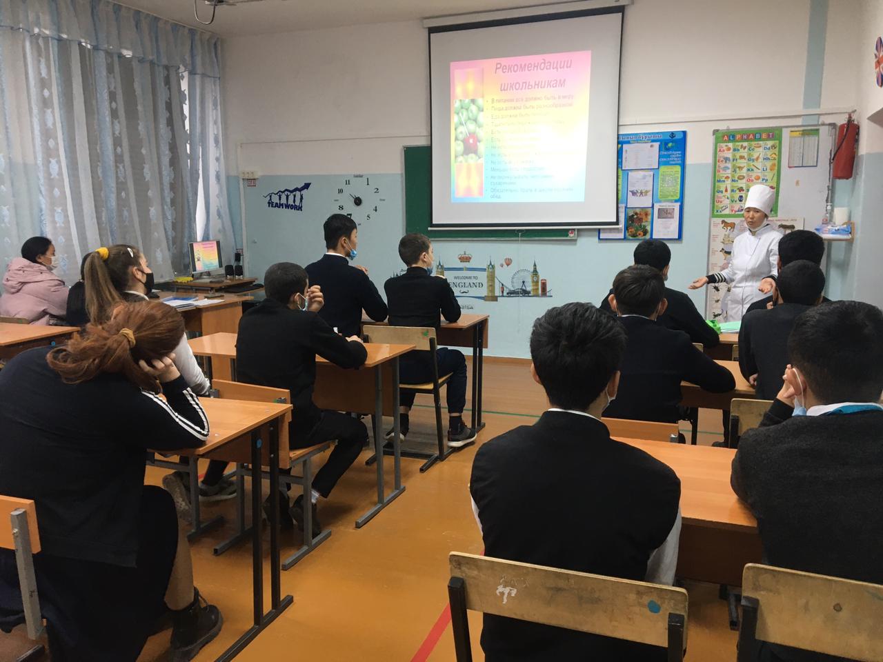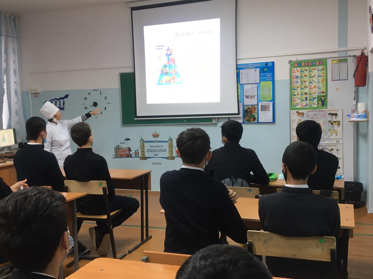 Р.Қошқарбаев атындағы орта мектебінің 8-11 сынып оқушыларымен мектеп медбикесі Р.Лим «Дұрыс тамақтану жолдары» атты әңгіме өткізіді.Мақсаты: Оқушыларды дұрыс тамақтану мәдениетімен таныстырып,денсаулық құндылығы, дұрыс тамақтану туралы түсініктерін кеңейту . Денсаулықты күтуге, дұрыс тамақтана білуге,салауатты өмір салтын ұстануға тәрбиелеу.