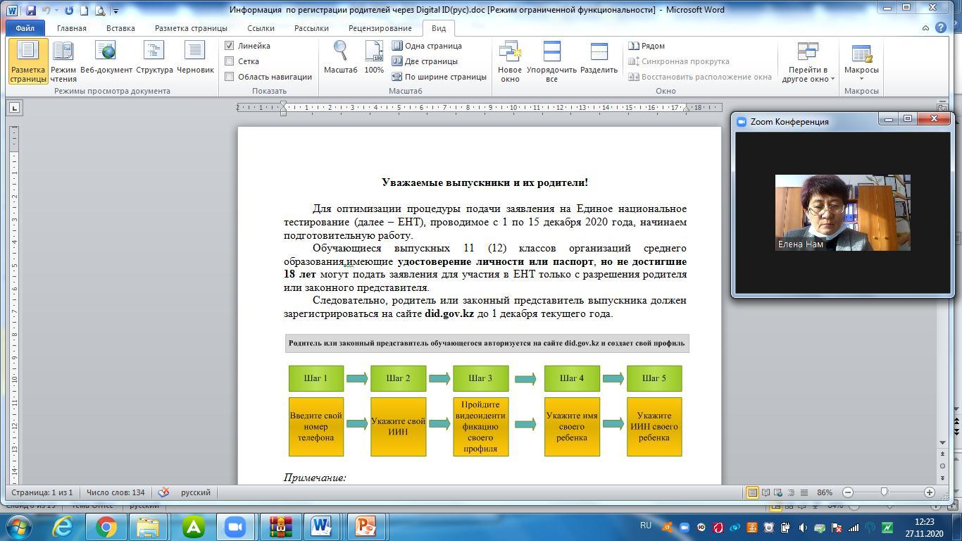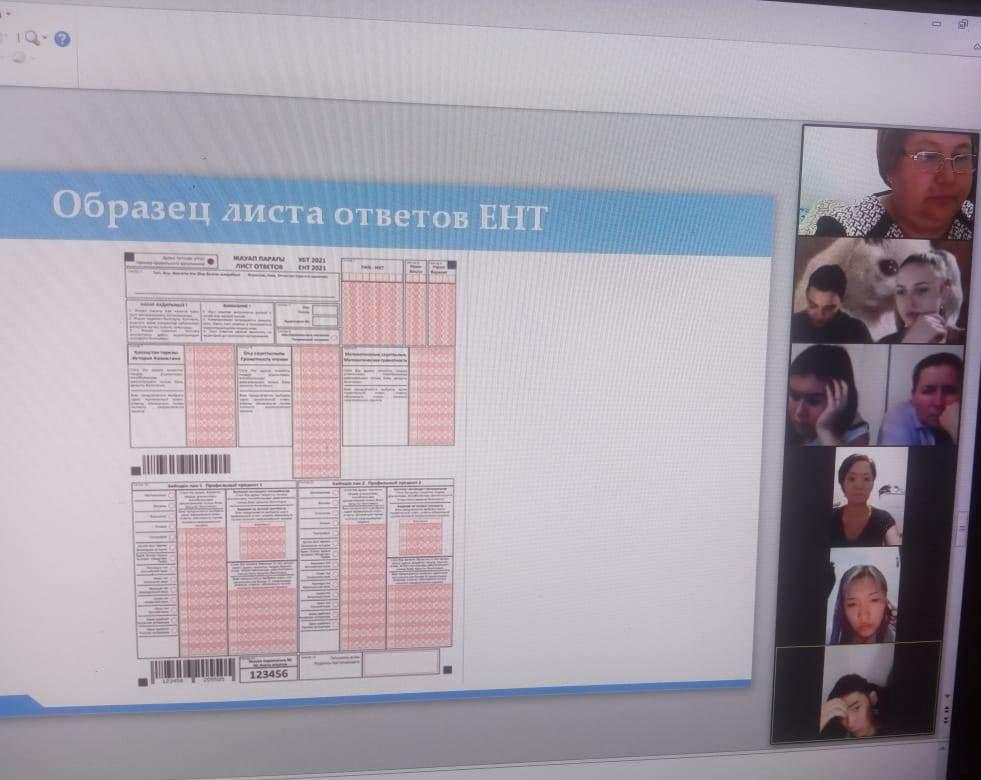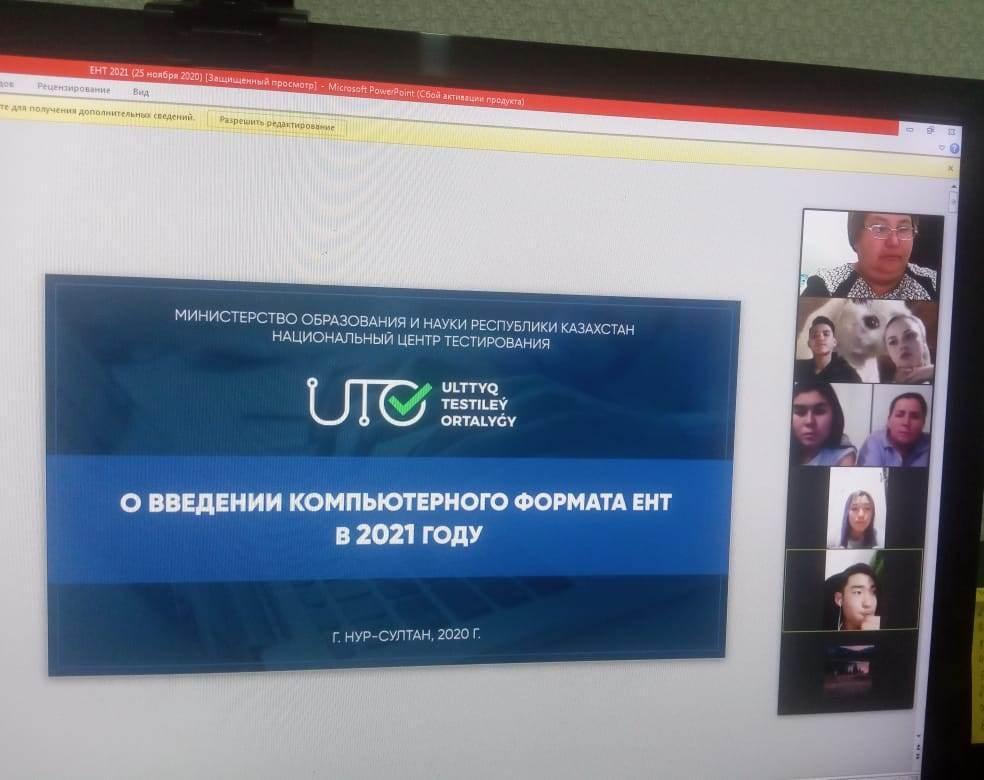 26 ноября 2020 года в СШ имени Р.Кошкарбаева была проведена видеоконференция, в которой приняли участие учащиеся 11 классов, родители и педагоги. Заместитель директора по учебной работе Е. Нам ознакомила с правилами проведения ЕНТ в январе 2021 года, с изменениями количества тестовых заданий по предметам.