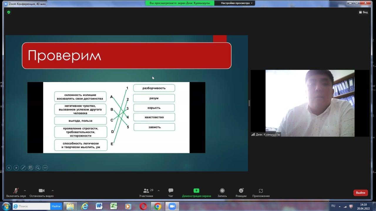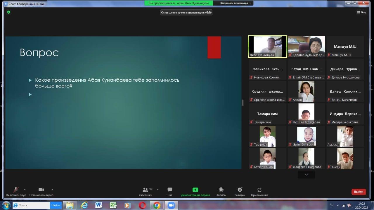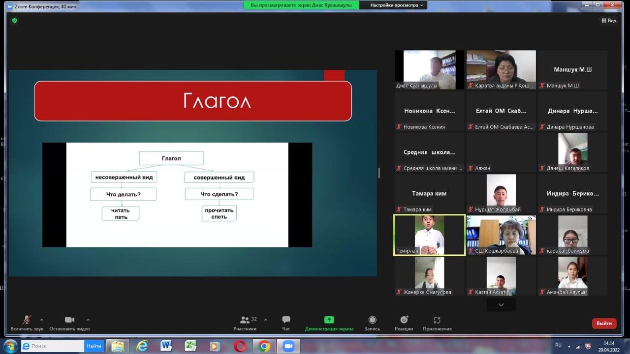 Р.Қошқарбаев атындағы ресурстық орталығы мен жетекші мектептің семинары және көктемгі сессиясы шеңберінде бағдарлама мен сабақ кестесі құрастырылып жұмыс атқарылуда. Магниттік Елтай МДШО бар орта мектебінің орыс тілі мен әдебиеті пәнінің мұғалімі Жарысқасын Диас Қуанышұлы 9 сынып оқушыларымен "Абай: не будь падким на все" тақырыбында ЗУМ платформасын қолданып ашық сабақ өткізді. Сабақ жоғары дәрежеде ойластырылған, қолданылған әдіс тәсілдері тиімді, әрі оқушыларға түсінікті болды. Оқушылар белсенді түрде қатысып тапсырмаларды дұрыс орындап, Абай атамыздың "Көзімнің қарасы" әнінен үзінділер айтып және де "Жаз" шығармасын мәнерлеп оқып беріп, қатысушыларды қуантты. Сабақта бейне роликтер орынды көрсетілді. Оқушыларға қойылған сұрақтар шығармашылық қабілеттерін дамытуға көзделді. Ашық сабаққа барлық жетекші және магниттік мектептерінен 20 мұғалім қатысып, кері байланыс, пікірлерін чатқа жазып отырды. Диас Қуанышұлының жұмысына шығармашылық табыс тілейміз! Көп рахмет.