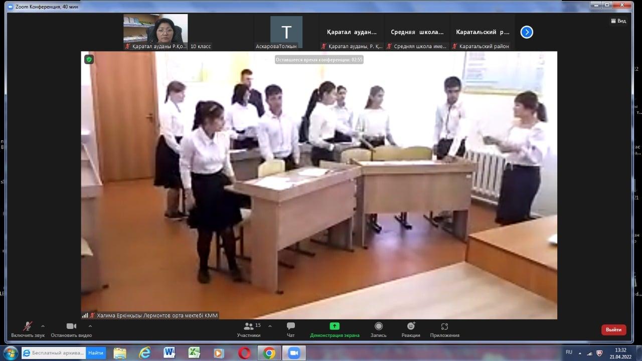 Р.Қошқарбаев атындағы ресурстық орталығының магниттік мектептері арасындағы «Тілдік пәндер сабақтарында жоғары деңгейлі сұрақтар қою арқылы оқушыларға көркем шығарма мазмұнын игерту» тақырыбында ұйымдастырылған көктемгі қорытынды сессия шеңберінде Лермонтов атындағы орта мектебінің қазақ тілі мен әдебиеті пәнінің мұғалімі Халима Еркінқызы 10 орыс сынып оқушыларымен "Ауыл мен қала айырмашылығы" тақырыбында ашық сабақ өткізіп, сабақта оқу сауаттылығын дамыту мақсатында "Мәтінмен жұмыс" - Джигсо әдісімен, ПОПС формула, суретпен жұмыс, пікір-талас әдістерін тиімді қолдана білді. Оқушылар алған білімдерін "Бір ауыз сөз" әдісі арқылы бір -бірін және мұғалім оқушыларды бағалап , сындарлы кері байланыс орнатты. Ашық сабаққа барлық мектептерден 21 пән мұғалімі қатысты. Сабақ әдістемелік тұрғыда дұрыс, тартымды және танымды болып ұйымдастырылды.
