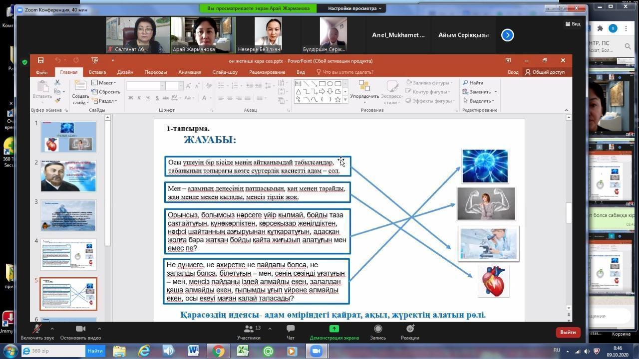 Қазақ тілі мен әдебиеті пәнінің мұғалімі Жарманова А.С. 10 сынып оқушыларымен "Абайдың он жетінші қарасөзі. Көркем шығармалардан алған үзінділерді ғаламдық тақырыптағы өзекті мәселермен байланыстыру." Тақырыбында өткізген сабақтанмектептерінің мұғалімдері мен жоғары сынып оқушыларының білім беру платформаларын және виртуалды тақтаны қолдануды үйреніп, сабақта пайдалану дағдылары өткізілген сабақтардан дамып келетіні байқалады.