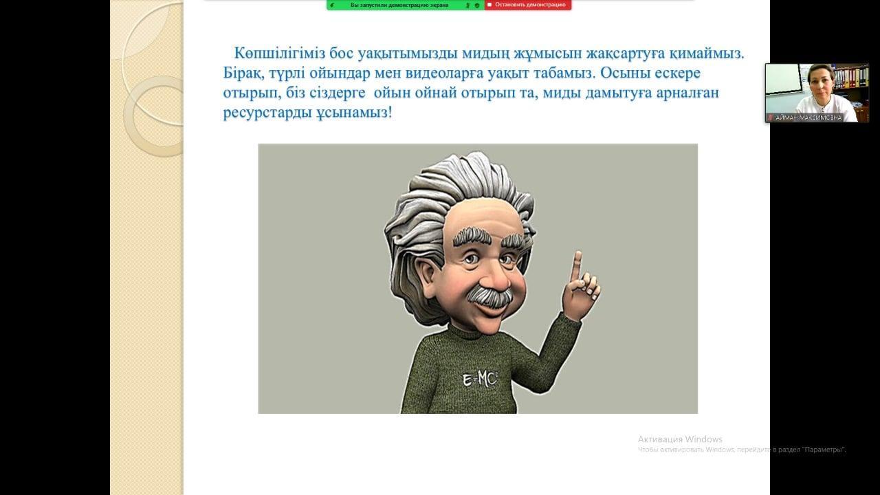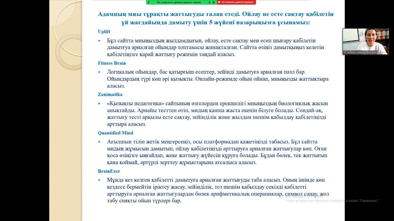 Р. Қошқарбаев атындағы ресурстық орталығының магниттік мектептері арасындағы «Тілдік пәндер сабақтарында жоғары деңгейлі сұрақтар қою арқылы оқушыларға көркем шығарма мазмұнын игерту» тақырыбында ұйымдастырылған көктемгі қорытынды сессия шеңберінде педагог- психолог Асанова Айман Максимовна мұғалімдерге арналған "Қалай ақылдырақ болуға болады?" атты психологиялық тренинг өткізді. Тренингте Айман Максимовна адамның миын дамытуға мүмкіндік беретін түрлі жаттығулар мен ақылды болудың 8 әдісін ұсынды. Сонымен қатар, мұғалімдерге сандармен жаттығуларды міндетті түрде жасау керектігін айтып практикалық түрде көрсетіп, жаттығулар сілтемелерін ұсынды. Іс- шараға барлық магниттік мектептерден 20 мұғалім қатыстып, ойларымен бөлісіп, жақсы тілектерін білдірді.