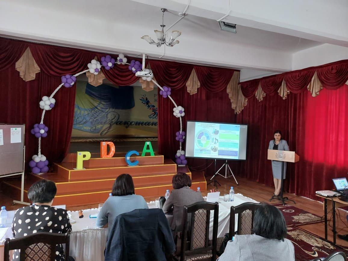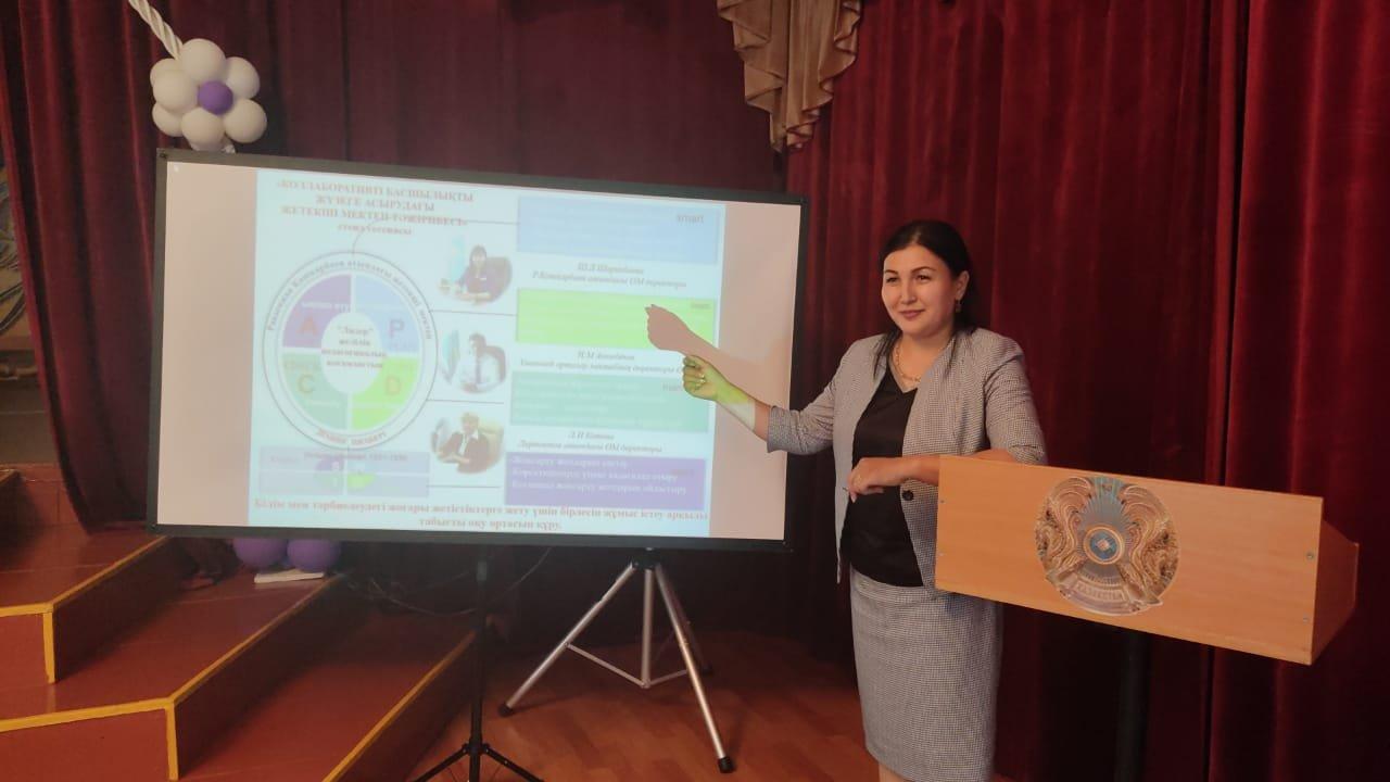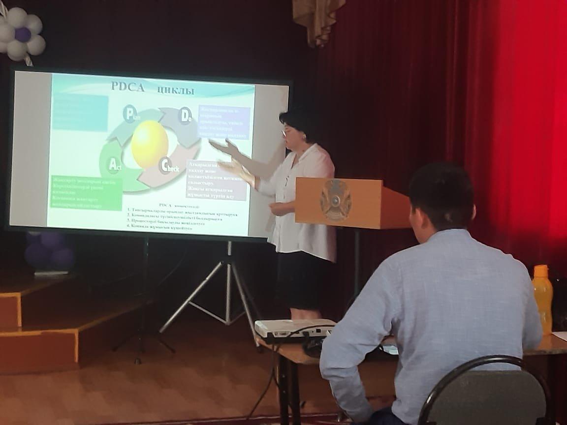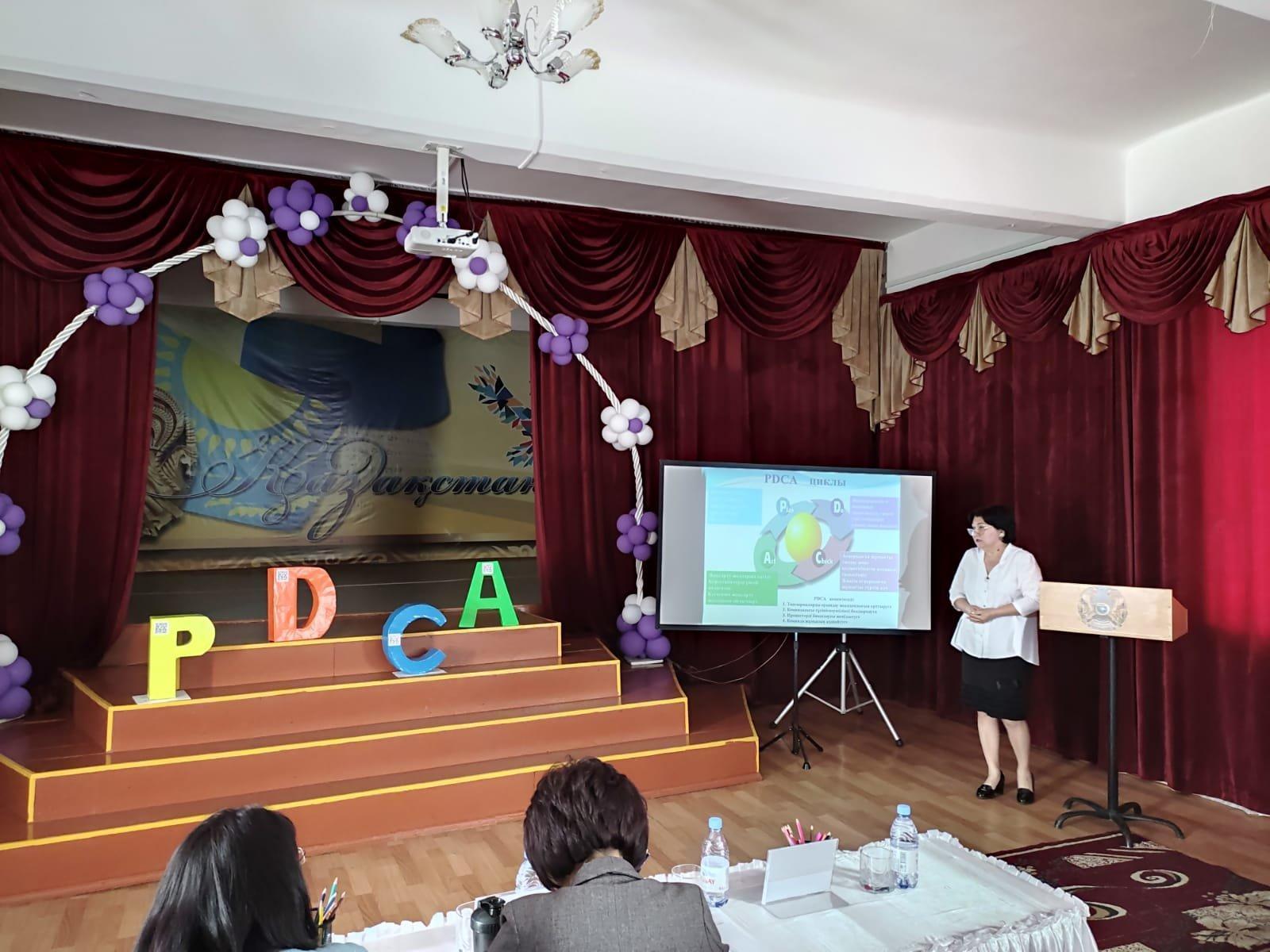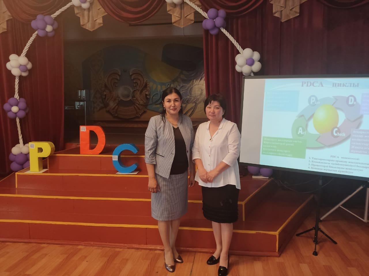 жұмысының нәтижесі бойынша стенд сессиясы ұйымдастырылды. Р.Қошқарбаев атындағы жетекші мектебінің директоры Шарықбаева Ш.Д. және директордың әдістеме ісі жөніндегі орынбасары Абдулкаримова С.М. "PDCA әдістемесі немесе Deming циклы – сапа өсуінің катализаторы" тақырыбында мектебіміздің жұмыс жүйесін ұсынып, жүлделі ІІІ орынға ие болды.