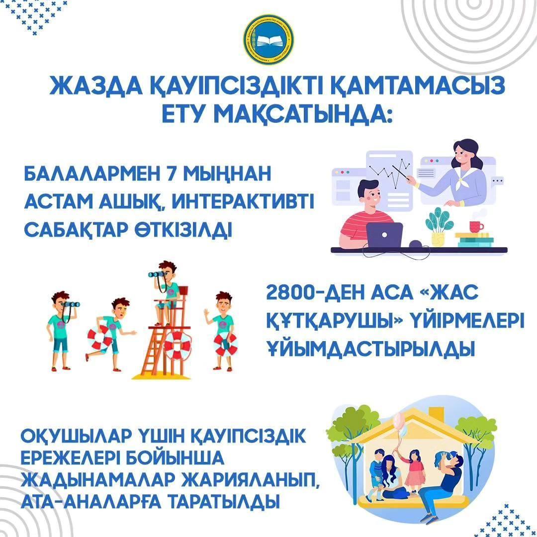 • жазғы демалысты ұйымдастыру кезінде бірыңғай, қауіпсіз тәсілдерді қамтамасыз ету үшін мемлекеттік органдар және қоғамдық ұйымдармен арнайы семинар-кеңес ұйымдастырылды;