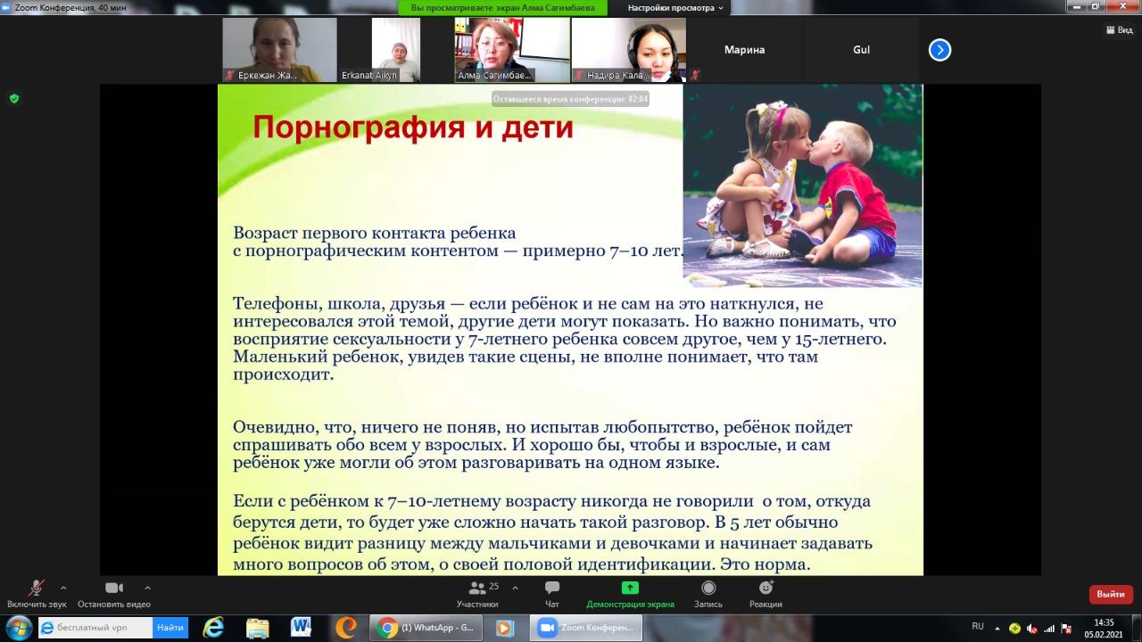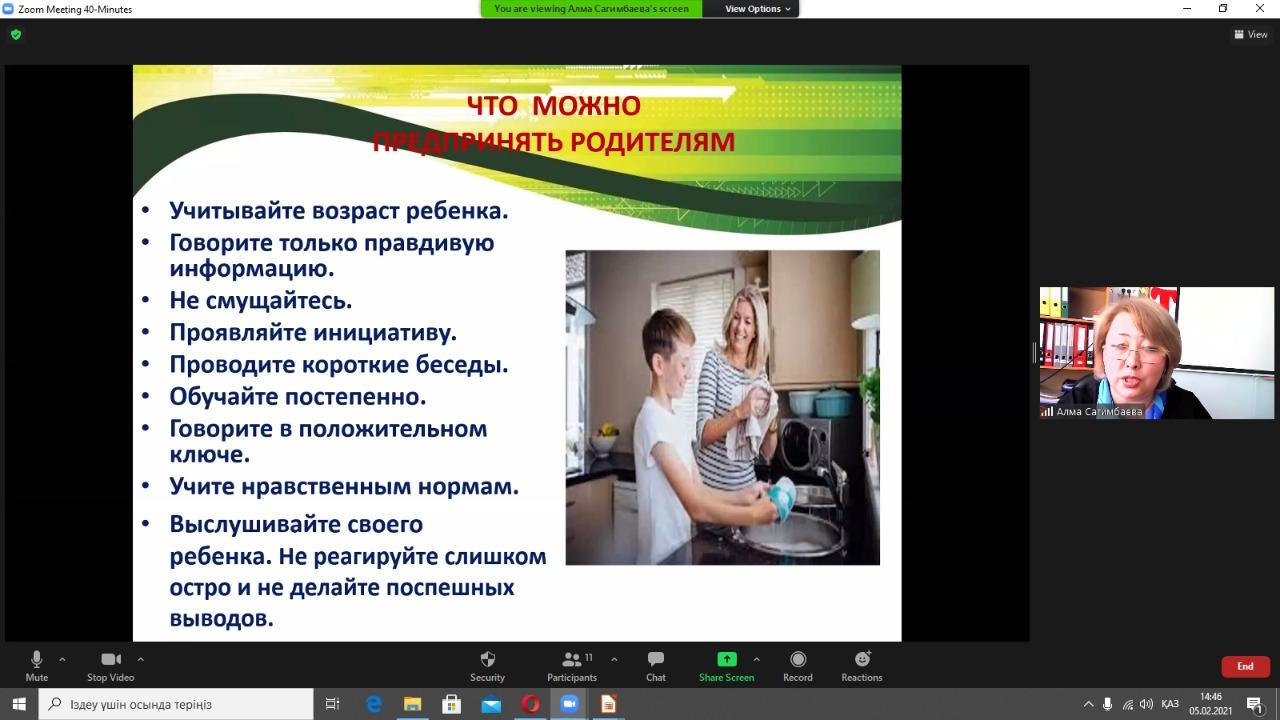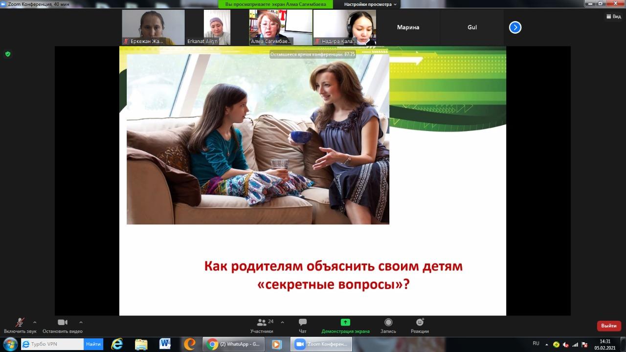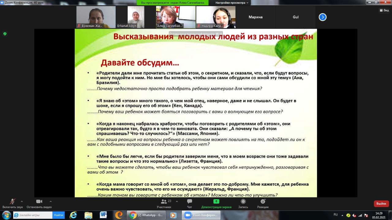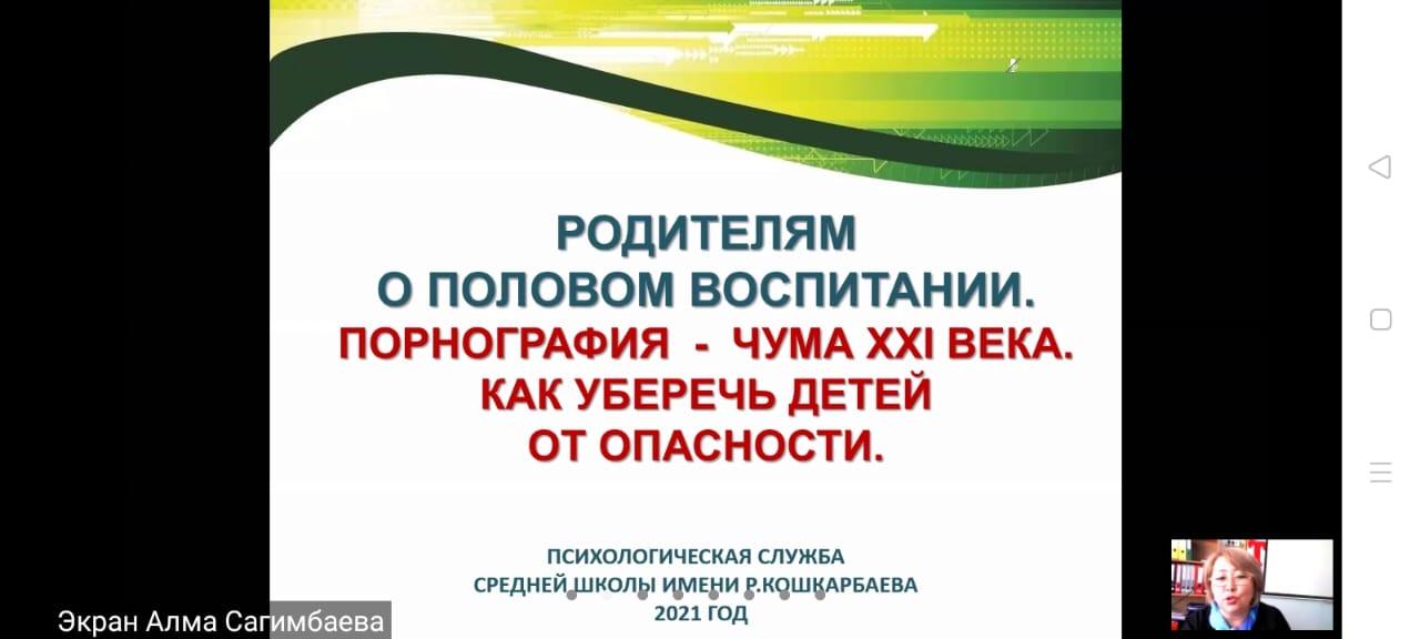 Р.Қошқарбаев атындағы орта мектебінде 2021 жылғы ақпан айында репродуктивті денсаулық бойынша (адамгершілік және жыныстық тәрбие) өткізілетін іс-шаралар жоспарына сай мектеп психологы, медбике және аудандық СӨС насихаттау бөлімінің маманы А.Сергеевнаның қатысуымен тақырыбында ата-аналармен семинар өткізілді. Parents репродуктивті денсаулық жайлы мағлұматтар беріліп, жыныстық тәрбие бойынша балалармен қалай дұрыс сөйлесу керек, осы мәселелер бойынша ұсыныстар берілді. Медбике Р.Лим «Жыныстық жолмен берілетін инфекциялар» туралы ақпараттармен таныстырды.