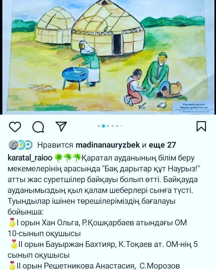 «Наурыз» мерекесін атап өту қарсаңында «Наурыз» мерекесінің қазақ даласындағы орны, наурыз мерекесі туралы түсінік беру, балаларды елін, Отанын сүюге, ұлттық салт-дәстүрін дәріптеуге тәрбиелеу; имандылық, инабаттылық, ізеттілік қасиеттерін қалыптастыру мақсатында ұйымдастырылған аудандық «БАҚ ДАРЫТАР ҚҰТ НАУРЫЗ!» атты жас суретшілер байқауына Almaty region Қаратал ауданы Р.Қошқарбаев атындағы орта мектебінің 10Б сынып оқушысы Хан Ольга қатысып, жүлделі I орынға ие болды.